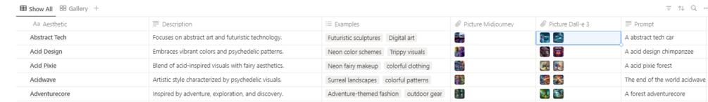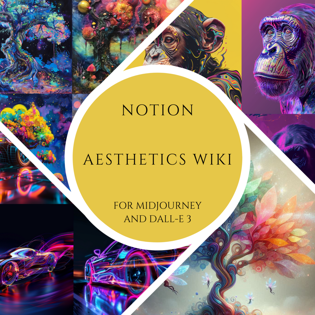 Aesthetics wiki, prompting for Midjourney and Dall-e 3, Notion database