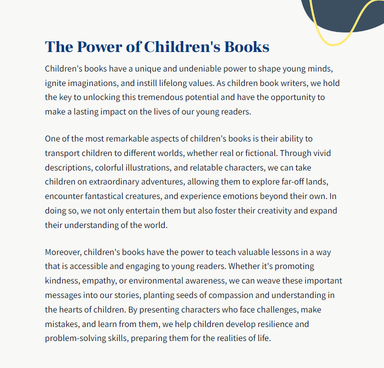 "Every child deserves a story that sparks imagination and joins them on extraordinary adventures. With 'A Step-by-Step Guide for Children's Book Authors,' you'll have all the tools and inspiration you need to create magic on every page."