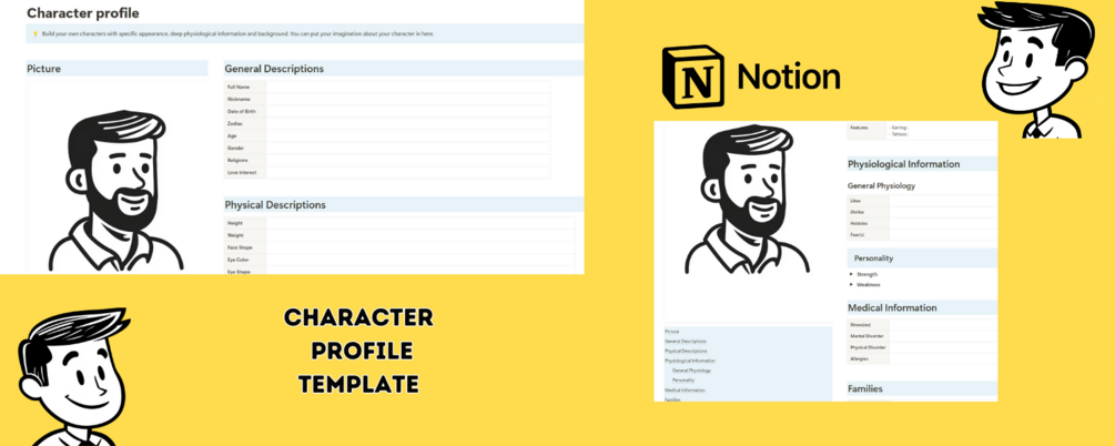 The character profile template allows you to create detailed and unique characters tailored to your imagination. From physical descriptions to deep physiological insights and comprehensive backgrounds, you can craft characters that feel real and engaging. Whether you're building protagonists, NPCs, or even antagonists, this tool provides the structure to flesh out their personalities, relationships, and personal histories with intricate detail.